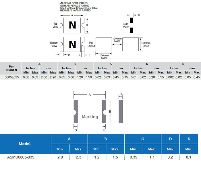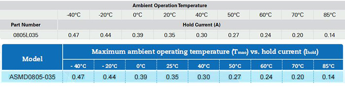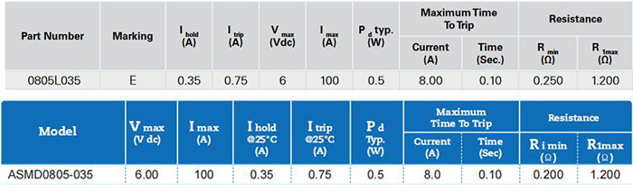 深圳集電通成熟的產(chǎn)品線貼片自恢復(fù)保險絲ASMD0805-035可替換Littelfuse力特品牌的0805L035,從電氣參數(shù)和指標對比:
