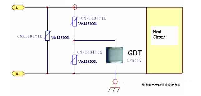 下圖是氣體放電管和壓敏電阻組合構成的浪涌抑制電路。由于壓敏電阻有一致命缺點:具有不穩定的漏電流,性能較差的壓敏電阻使用一段時間后,因漏電流變大可能會發熱自爆。為解決這一問題在壓敏電阻之間串入氣體放電管。在這種串聯組合支路中,氣體放電管起一個開關作用,當沒有暫態過電壓作用時,它能將壓敏電阻與系統隔離開,使壓敏電阻中幾乎無泄漏電流,從而有效地減緩壓敏電阻性能衰退。(推薦閱讀:10KA三級防雷管帶引腳6*8.5mm系列氣體放電管JTA36H)