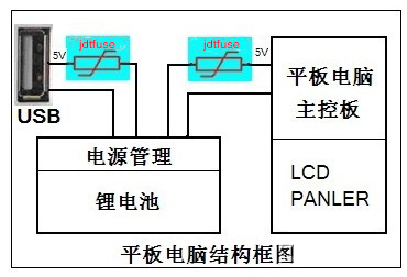 b) jdtfuse用于控制電路輸出與USB接口的5V電源線上,主要是為了避免USB負載短路使平板電腦的控制電路燒壞、同時也避免誤輸入灌電流使平板電腦內部電路燒壞。